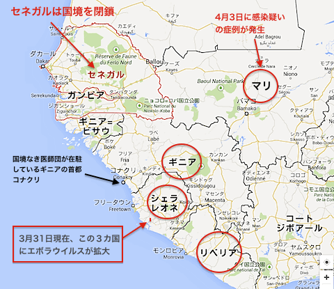 日本の面積が約377,900 km²、リベリアの面積が約111,400 km²日本の約1/3である。これから流行が疑われる国ギニア、シェラレオネを合わせると日本とほぼ同じか少し大きい面積となり、2月の発生を機に半年で爆発的に広がっている。マリの国土の広さを鑑みてここでの流行を食い止められなければ、人間と野生動物などを媒介とし、パンデミック(世界流行)になり兼ねない事態まで状況は深刻化していると考えてもいいのではないか?